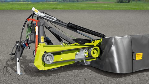 La faucheuse est entraînée par des arbres à cardan requérant une maintenance minime. La robuste transmission par courroie minimise les pics de charge et peut être tendue sans outil via un bouton rotatif. La force est alors transmise via un réducteur double qui assure l'entraînement à l'entrée du lamier, juste au-dessus du premier disque de coupe – un sabot intérieur n'est pas nécessaire et le flux de fourrage est optimal.