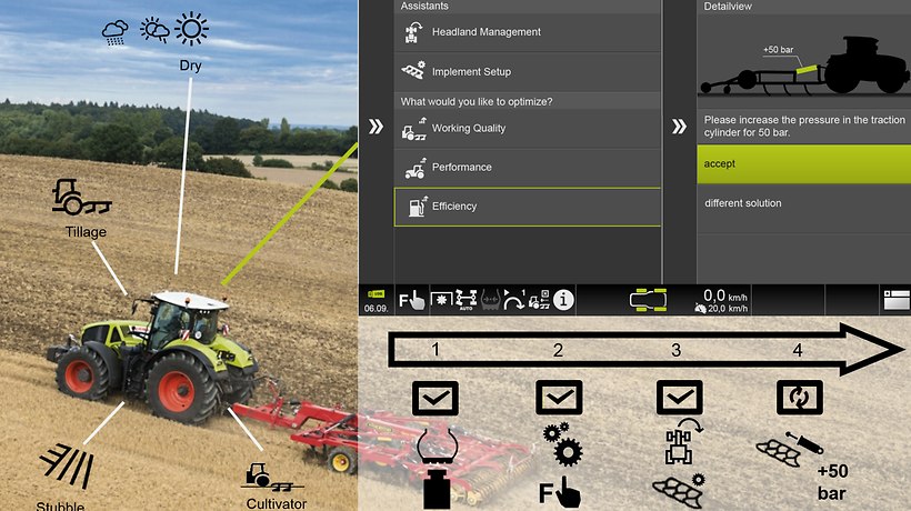 Le système CEMOS pour les tracteurs est un nouveau système d’assistance au conducteur basé sur le dialogue Homme-Machine, pour optimiser les réglages des tracteurs et de leurs outils. Pourvu d’une base de données d’expertise, il guide pas à pas le conducteur jusqu’aux réglages optimaux via l’interface utilisateurs du terminal CEBIS à écran tactile, en fonction de l’application actuelle et des conditions de travail. Les recommandations de réglage concernent notamment les paramètres machines les plus divers, les conditions d’utilisation et les préférences du conducteur. Certains réglages sont réalisés directement par le CEMOS, à la demande du conducteur. Si besoin, celui-ci peut également se laisser guider pour le réglage de certaines fonctions du tracteur, comme la gestion des fourrières CSM. Le système assiste en premier lieu le conducteur pour les réglages de base, puis les contrôle à nouveau ultérieurement en conditions réelles, pour les optimiser le cas échéant.