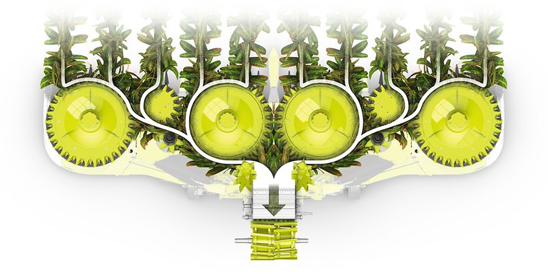 Grâce à ces atouts et à la combinaison de disques de transport de petite et de grande dimension avec une structure à trois niveaux, l'ORBIS 900 peut être utilisé tant pour la récolte du maïs que pour celle des céréales immatures.
