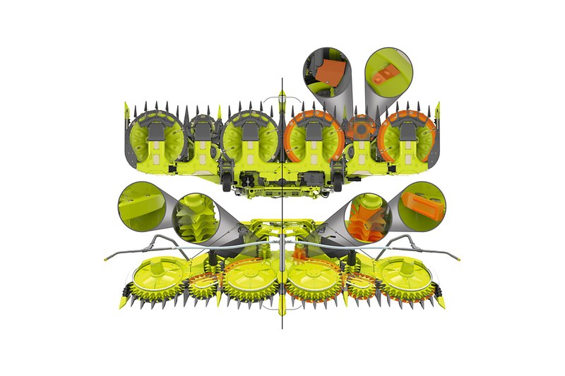- Architecture extrêmement plate pour une récolte parfaitement régulière et une faible hauteur de coupe jusqu'à 80 mm