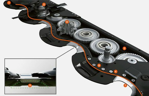 La combinaison des avantages de différents systèmes d'entraînement confère au lamier un caractère absolument unique et une efficacité inégalée. Du fait de la forme ondulée du lamier, les pignons d'entraînement de grand diamètre du disque de coupe sont très avancés et s'emboîtent en deux points avec plusieurs dents. L'espacement régulier des disques assure une coupe parfaite dans toutes les conditions de récolte. Le lamier MAX CUT est graissé à vie et ne requiert donc aucun entretien.