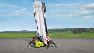 Le support de remisage pratique est disponible en option avec ou sans roues. Après le travail, la faucheuse se replie en position de transport. Le support de rangement à roues permet de la remiser dans les endroits exigus et de la manœuvrer facilement sans tracteur.