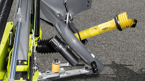 Le centre de gravité de la machine se décale encore vers le centre pour permettre une répartition régulière de la charge sur les roues arrière du tracteur. L'implantation d'un réducteur double a permis de réduire la largeur de transport et de dégager la visibilité vers l'arrière. Un vérin à piston flottant double effet garantit un dépliage sûr en dévers et un amortissement en fin de course.