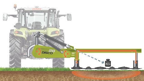 Le grand ressort de souplesse intervient au centre du cadre de la machine. La ligne de force du ressort passe en outre exactement par le centre de gravité de l'unité de fauche. Grâce au support intérieur et extérieur, la force est transmise régulièrement au lamier
