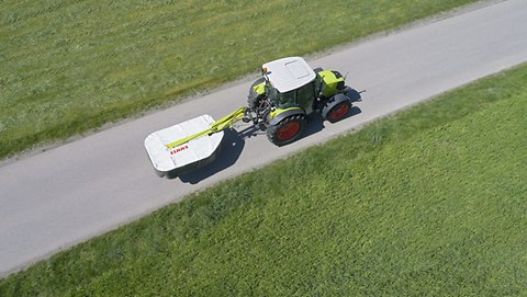 La position de transport à 120° et le centre de gravité proche du tracteur garantissent une grande stabilité et une faible hauteur pour les déplacements. Comme elle est inclinée, la faucheuse laisse la vue dégagée dans les rétroviseurs extérieurs. La répartition équilibrée des charges sur l'essieu arrière permet un déplacement sans secousses ni vibrations. Vous pouvez ainsi circuler et manœuvrer sur la route en toute sécurité.