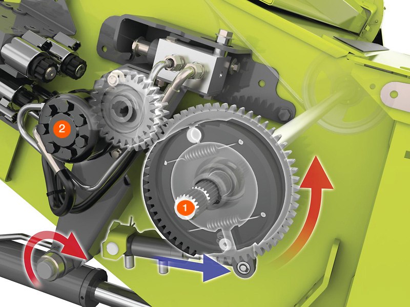 L'inverseur hydraulique (2) permet d'éliminer facilement les bourrages grâce à un couple très élevé au démarrage. Il est activé depuis la cabine par simple pression sur un bouton. Le sens de rotation du rabatteur à commande hydraulique est lui aussi modifié automatiquement pour plus d'efficacité.