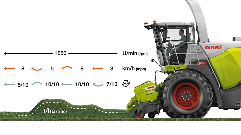 Le CEMOS permet d'améliorer les performances jusqu'à 7 % pour la productivité en ha/h et jusqu'à 12 % pour les économies de carburant. Pour améliorer la productivité et abaisser la consommation, la JAGUAR maintient constant le régime moteur réglé et régule la puissance moteur et la vitesse d'avancement en fonction du débit. Si par exemple le débit augmente, la vitesse d'avancement diminue. Si le débit diminue, la puissance moteur est réduite automatiquement.