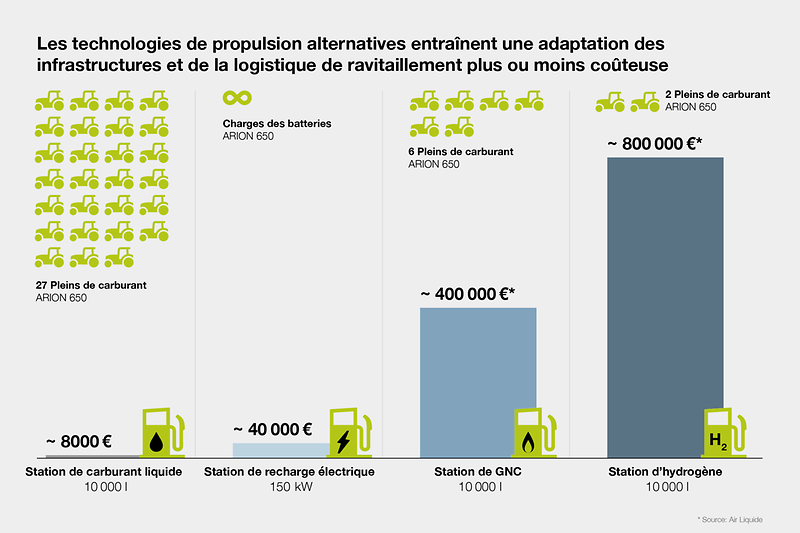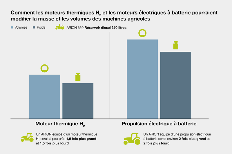 À l'heure actuelle, l'utilisation de l'hydrogène dans des piles à combustible semble irréaliste comme solution de propulsion alternative dans l'agriculture. En effet, les machines agricoles mobilisent beaucoup de puissance en un laps de temps très court, un contexte inadapté à la pile à combustible. En revanche, on pourrait envisager à l'avenir l'utilisation de moteurs thermiques fonctionnant à l'hydrogène. Contrairement à une propulsion électrique, cette solution présenterait l'avantage de pouvoir conserver une grande partie de la chaîne cinématique des machines agricoles fabriquées jusqu'ici, malgré le changement de moteur. Toutefois, l'alimentation en hydrogène supposerait un volume de réservoir dix fois supérieur à celui des systèmes actuels, ce qui obligerait l'agriculteur à faire des appoints de carburant plus fréquemment. L'espace nécessaire à l'intégration d'un tel système obligerait à repenser totalement l'architecture des machines modernes. De plus, un certain nombre d'obstacles devraient être surmontés en termes d'infrastructure et de logistique. La construction d'une propre pompe de distribution d'hydrogène représenterait un surcoût énorme par rapport à une pompe à gazole. Pour cela, un agriculteur devrait investir près de 800 000 euros actuellement. Enfin, contrairement à l'électricité disponible depuis une simple prise, l'agriculteur aurait à prévoir des livraisons très fréquentes d'hydrogène sur son exploitation.