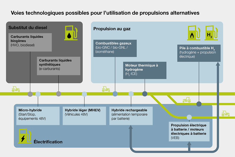 La technologie d'entraînement la plus prometteuse est celle des carburants « Drop-in-Fuel » qui présentent l'avantage de ne nécessiter aucune transformation du véhicule pour pouvoir être utilisés. Pour leur production, on utilise notamment des déchets organiques et des huiles, comme pour la production des carburants HVO. L'« E-Fuel » est un autre type de carburant « Drop-in-Fuel », lequel est obtenu avec de l'électricité à partir d'eau et de CO2. Certes, l'utilisation de carburants « Drop-in-Fuel » génère du CO2, tout comme avec le gazole, mais leur production permet d'éliminer la même quantité de CO2. Bref, ce sont des carburants à bilan carbone neutre. De plus, le passage à des carburants HVO serait, par comparaison directe, la solution à la fois la plus économique et la plus efficace, étant donné que les parcs de machines existants pourraient en bénéficier. Une exploitation agricole moyenne devrait pour cela investir environ 8 000 euros seulement pour stocker le carburant.