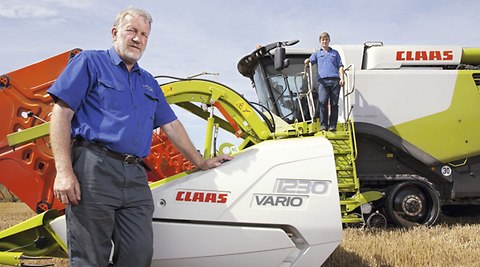 Robert et Ed Salmon, Comté de Norfolk, Grande-Bretagne Surface exploitée : 1 964 ha Cultures : blé d'hiver (649 ha), orge d'hiver (209 ha), orge d'été (99 ha), haricots verts (270 ha), multiplication de semences (46 ha), graines de lin (153 ha), colza (361 ha), maïs d'ensilage (42 ha), seigle fourrager (9 ha), seigle brassicole (39 ha), betteraves à sucre (30 ha), pommes de terre et oignons (58 ha) Sols : sols principalement argileux, sols partiellement sablonneux et légers Effectif : Robert et Ed Salmon, quatre employés, plusieurs saisonniers en période de récolte Moissonneuse-batteuse actuellement utilisée : LEXION 780 TERRA TRAC
