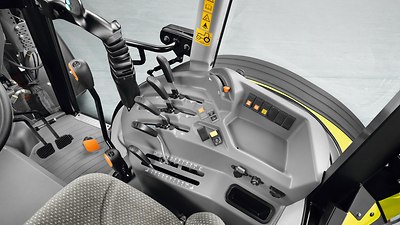 Le chargeur frontal CLAAS de l'ELIOS 200 se pilote avec la commande PROPILOT intégrée à la console de droite. Cette commande monolevier multifonctions par câbles a été spécialement conçue pour la commande d'un chargeur frontal. Son efficacité au quotidien n'est plus à prouver.